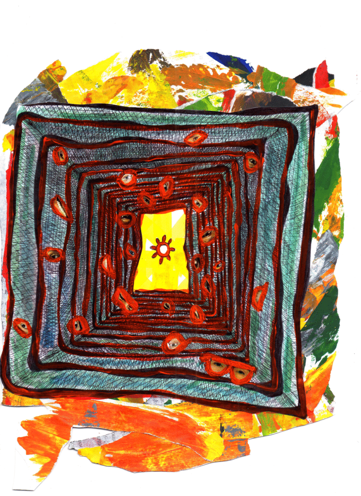 En mis apuntes del mundo de la vigilia intenté dejar que mi pluma decidiera hacia dónde íbamos, y eso mismo hice luego con el collage: dejé que mi brújula interna tomara la decisión de hacia dónde ir.